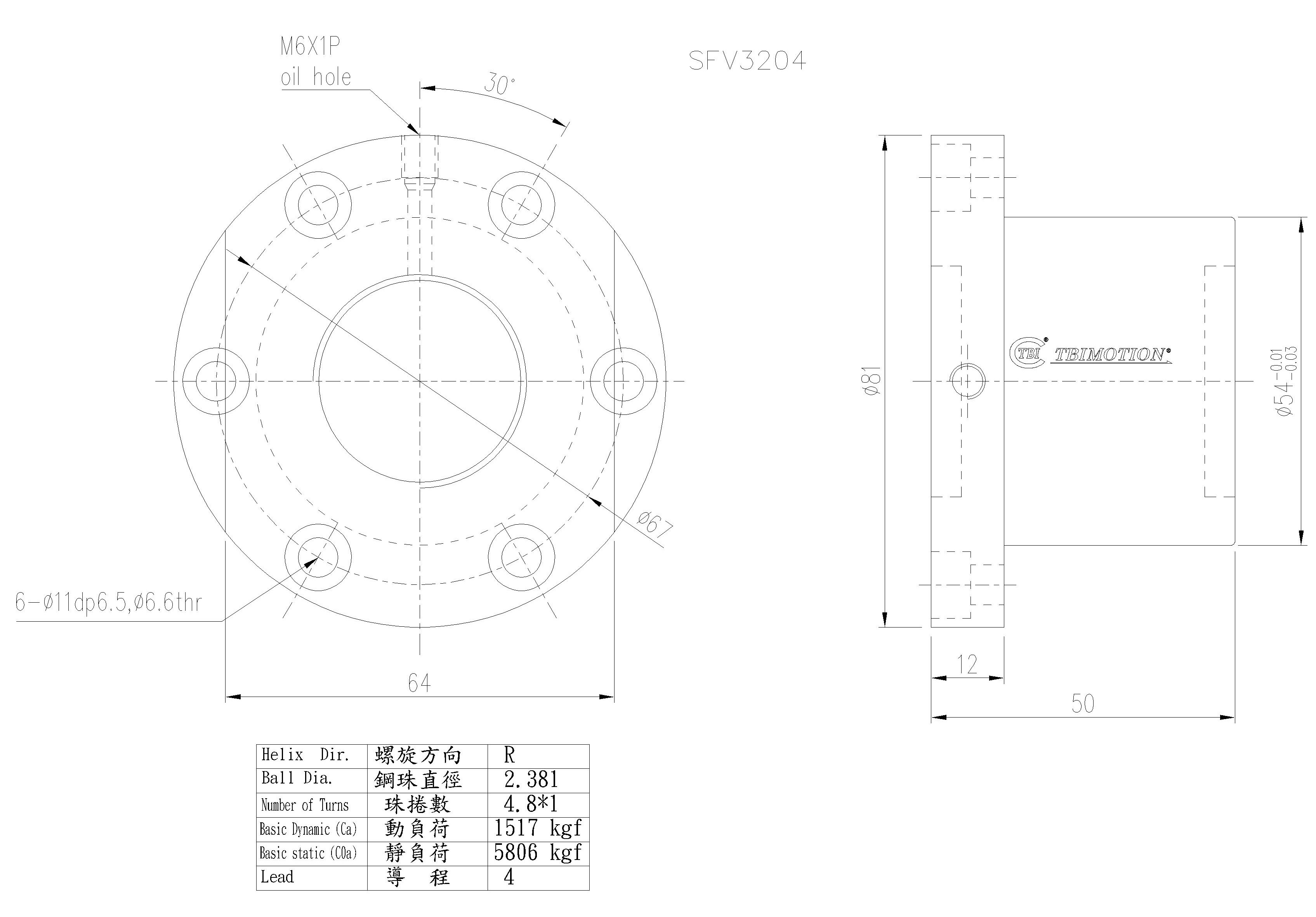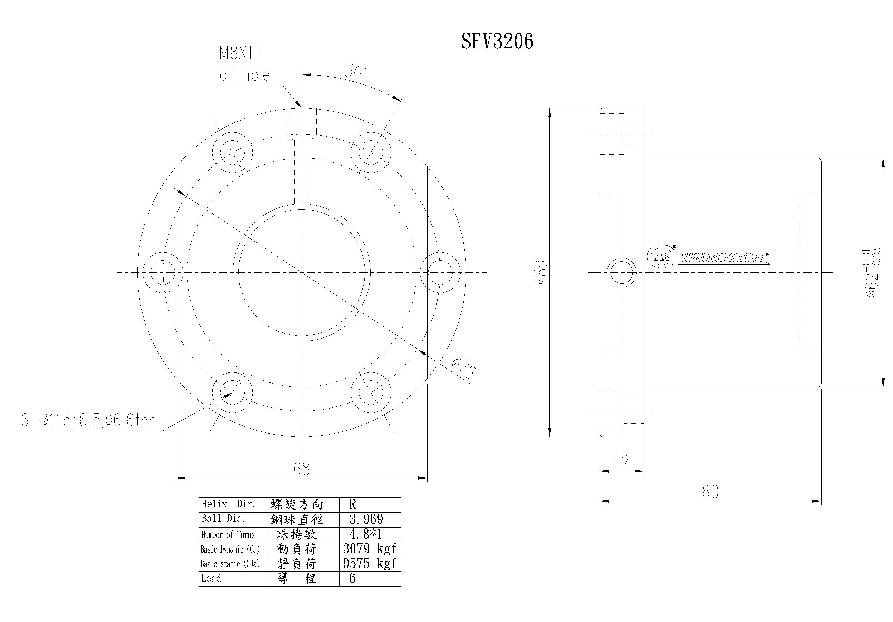 tbi滚珠丝杆螺母SFVR03206D1D,SFNIR03206D1N,法兰双切边或者全圆,丝杆直径32,导程06,珠圈数4.8*1,珠直径3.969,动额定负荷3079,静额定负荷9575,刚性70。
