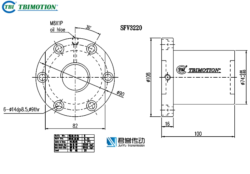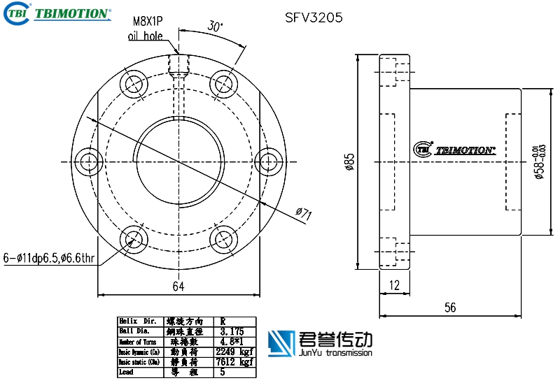 tbi滚珠丝杆螺母SFVR03220B1D,SFNIR03220B1N,法兰双切边或者全圆,丝杆直径32,导程20,珠圈数2.8*1,珠直径6.35,动额定负荷3509,静额定负荷8644,刚性46。