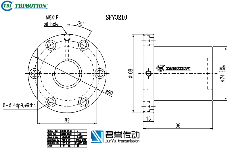 tbi滚珠丝杆螺母SFVR03210D1D,SFNIR03210D1N,法兰双切边或者全圆,丝杆直径32,导程10,珠圈数4.8*1,珠直径6.35,动额定负荷5620,静额定负荷14649,刚性76。